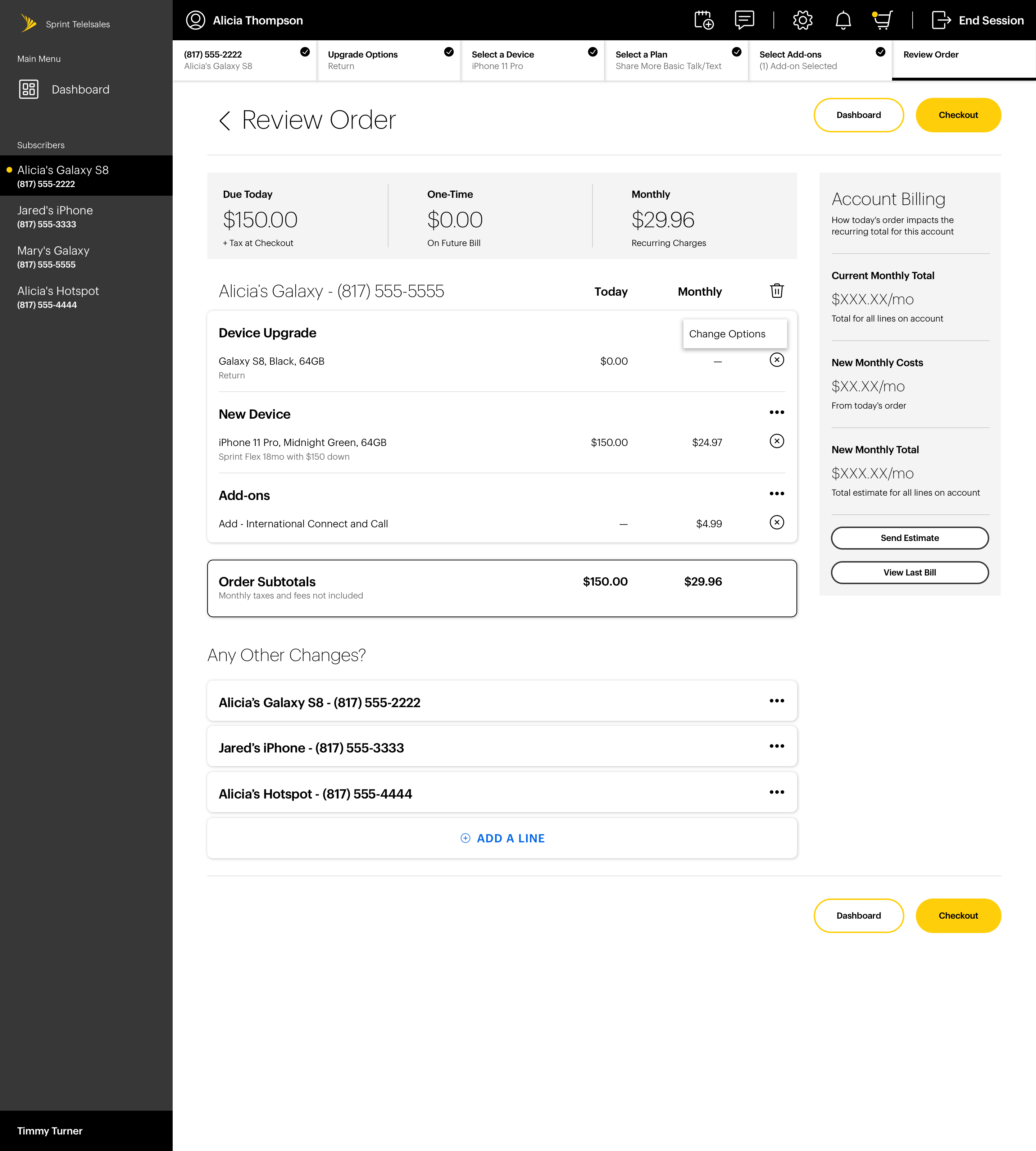 While the rep is making changes to the account (adding lines, upgrading devices, etc.) we've displayed a dynamic step tracker at the top of the UI.